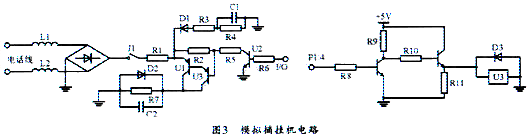 | 1 振鈴檢測電路 當振鈴電路檢測到鈴流信號時.以響鈴四次為準,即響鈴四次后無人摘機,便由單片機控制自動模擬摘機。電話振鈴信號通過電容隔直、電阻限流、整流橋的整流、電阻分壓、光電耦合器和電位器共同組成振鈴信號變換電路。它們使輸入電壓和電流輸出到單片機AT89C52的I/O口。系統(tǒng)中斷采用定時查詢方式。響鈴四次后,單片機將控制繼電器模擬摘機,以完成振鈴音的檢測。振鈴檢測電路設計如圖2所示。