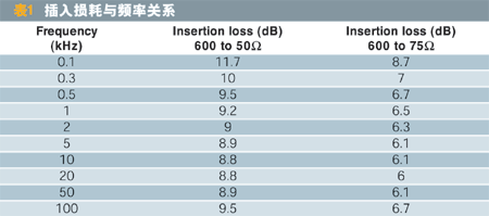 為了在600Ω測(cè)試裝置中作頻響和衰減驗(yàn)證,將兩個(gè)獨(dú)立部件背對(duì)背地通過(guò)50Ω或75Ω端子連接起來(lái)。將600Ω ~ 600Ω?jìng)鬏敁p耗測(cè)量值減半,就可得到單個(gè)部件的測(cè)量值數(shù)據(jù)(表1)。