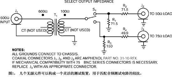 若要將一個(gè)600Ω的音頻電路連接到一個(gè)50Ω或75Ω電路或測(cè)試儀器上,就需要一個(gè)阻抗匹配電路;或者對(duì)電路作隔離時(shí),還需要一個(gè)變壓器。兩種方法各有利弊。常見(jiàn)的變壓器可以用低至1.5 dB的典型損耗實(shí)現(xiàn)阻抗匹配,提供直流隔離作用,并能用于平衡或不平衡運(yùn)行的600Ω初級(jí)電路。高質(zhì)量變壓器的通帶可以適合于音頻300 MHz ~ 15 kHz的范圍,并具有程度的振幅變化。但是,可以使600Ω與50Ω或75Ω匹配的變壓器并不容易得到,而且可能價(jià)格昂貴。