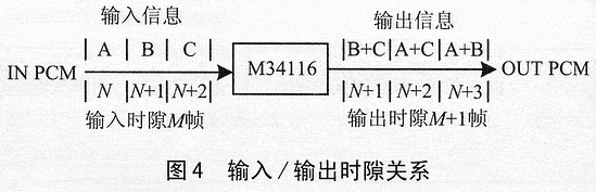 M34116是專為PCM數(shù)字交換應(yīng)用而設(shè)計(jì)的器件,能匯接64方會(huì)議和多29組會(huì)議。M34116與交換網(wǎng)絡(luò)、微處理器連接中圖3所法。交換網(wǎng)可以采用M3488或MT8980D等數(shù)字交換網(wǎng)絡(luò)。經(jīng)過PCM編碼后,其輸出時(shí)隙比輸入時(shí)隙延時(shí)一個(gè)幀(加一個(gè)時(shí)隙),因此,做會(huì)議接續(xù)時(shí)應(yīng)延時(shí)一個(gè)時(shí)隙。輸入、輸出關(guān)系如圖4所示。M34116對(duì)每種工作模式的每一通道具有可編程衰減 或增益控制,輸入/輸出的范圍均為±15dB。