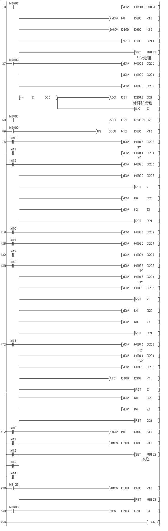 關(guān)于上述程序的說(shuō)明: ① 當(dāng) M10 接通以后變頻器進(jìn)入正轉(zhuǎn)狀態(tài)。 ② 當(dāng) M11 接通以后變頻器進(jìn)入停止狀態(tài)。 ③ 當(dāng) M12 接通以后變頻器進(jìn)入反轉(zhuǎn)狀態(tài)。 ④ 當(dāng) M13 接通以后讀取變頻器的運(yùn)行頻率( D700 )。 ⑤ 當(dāng) M14 接通以后寫(xiě)入變頻器的運(yùn)行頻率( D400 )。 |
