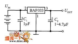 BAF033的輸出電壓為3.3V,輸出電流為50mA,輸人電壓為10V。用該器件組成的穩(wěn)壓電源,主要 用于工作電流較大的便攜式電子產(chǎn)品,如移動通信裝置、照相機等。