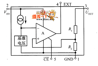 BAL系列的內(nèi)部結(jié)構(gòu)圖如圖3所示。它由基準(zhǔn)電壓源、誤差放大器、片選控制電路及決定輸出電壓的分壓 器電阻等組成。EXT端為外接PNP功率三極管的基極,由誤差放大器來控制外接三極管的內(nèi)阻,使輸出電壓 保持穩(wěn)定。CE腳為片選端,此端接低電平(接地)時,電源導(dǎo)通;此端接高電平時(接UIN),電源關(guān)閉 (各用模式)。UOUT接外接PNP功率三極管的集電極,VDD接輸人電壓,GND是地端。