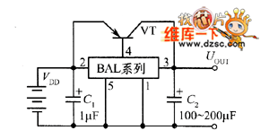BAL系列的應(yīng)用電路如圖4所示。VT為外接的PNP功率三極管;⑤腳(CE)接地,電源正常工作;C1為輸入 電容,一般取1μF;C2為輸出電容,可根據(jù)負(fù)載電流,在100~200μF間選??;輸入電壓UDD不大于10V。