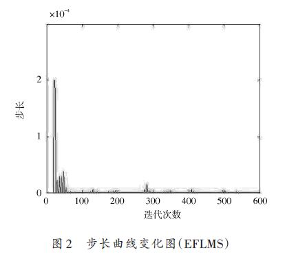 的算法中步長隨迭代次數(shù)的變化曲線如圖1所示,是EFLMS算法的步長變化曲線如圖2所示。