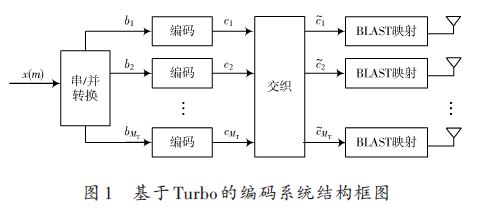 而Turbo 編碼內(nèi)部通過兩個或者多個帶反饋的系統(tǒng)卷積碼RSC級聯(lián)而成,每個子碼編碼器的輸入都由不同的交織器分開。因此有效地實現(xiàn)了隨機性編譯碼思想,而且能更靠近香農(nóng)的理論限。但是當傳輸信號是衰落信道,Turbo編碼的性能會受到很大的影響,尤其是當系統(tǒng)的接收機移動,甚至速度比較快時,僅僅將Turbo碼與分層空時編碼系統(tǒng)進行級聯(lián)使用,并不能取得良好的效果。因此,要提高系統(tǒng)的抗衰落性能,接收機需要加入匹配濾波器,在考慮時延因素時也需要采用均衡器。本文提出利用Turbo迭代檢測譯碼方法,將系統(tǒng)接收機設計為垂直分層空時迭代檢測解碼系統(tǒng),使之既提高了系統(tǒng)的容量,同時又增加了系統(tǒng)的抗衰落特性。