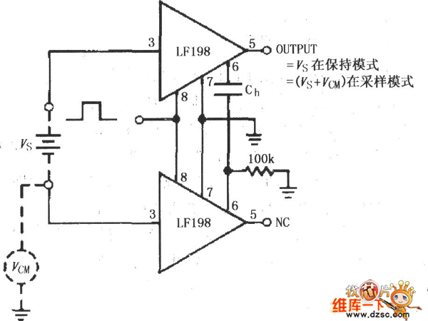 如圖所示為由兩個(gè)LF198構(gòu)成的差分輸入保持電路。采用兩個(gè)LF198的目的是利用電路的對稱性,消除共模電壓對電路產(chǎn)生的影響,使得在保持模式輸出為Vs(不含有VCM)。    來...