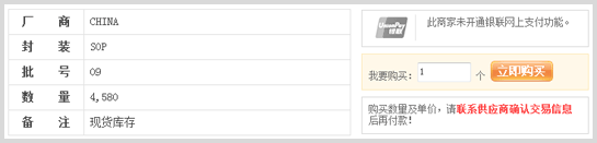 在搜索結(jié)果頁(yè)面,如果您查找的型號(hào)對(duì)應(yīng)的供應(yīng)商在維庫(kù)電子市場(chǎng)綁定了銀行賬號(hào),您可以看到相應(yīng)的型號(hào)下面有供應(yīng)商支持銀聯(lián)付款的標(biāo)志。找到您所需的型號(hào)并和供應(yīng)商談成交易后,點(diǎn)擊型號(hào)后面的"詢(xún)價(jià)"按扭,如右圖。