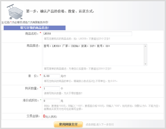 發(fā)起一個(gè)銀行支付交易,如右圖。填寫(xiě)相應(yīng)的商品信息,點(diǎn)擊下面的"使用銀行支付"按扭