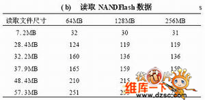 圖6(b)給出了從64MB、128MB、256MB的NAND2Flash中讀取不同尺寸數(shù)據(jù)所花費時間的實驗曲線。由圖可知,不管是何種存儲容量的NANDFlash,其讀取時間隨讀取數(shù)據(jù)尺寸變化基本呈線性變化。