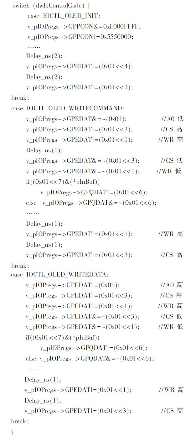 設(shè)備的I/O 控制向設(shè)備發(fā)出命令, 按照維信諾VGG13264C OLED 顯示模塊的時(shí)序關(guān)系, 通過控制相應(yīng)管腳的電平高低實(shí)現(xiàn)向設(shè)備發(fā)出命令。設(shè)備的I/O 控制在OED_IOControl 函數(shù)中實(shí)現(xiàn), 函數(shù)部分代碼如下: