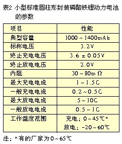 磷酸鐵鋰動力電池的容量有較大差別,可以分成三類:小型的零點幾到幾毫安時、中型的幾十毫安時、大型的幾百毫安時。不同類型電池的同類參數(shù)也有一些差異。這里再介紹一種目前應用較廣的小型標準圓柱形封裝的磷酸鐵鋰動力電池的參數(shù)。其外廓尺寸:直徑為18mm、高650mm(型號為18650),其參數(shù)性能如表2所示。