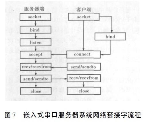 嵌入式串口服務(wù)器系統(tǒng)網(wǎng)絡(luò)套接字編程步驟如圖7 所示。