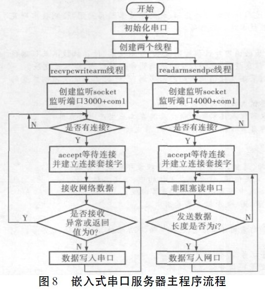 系統(tǒng)上電后,嵌入式服務(wù)器進入Linux 系統(tǒng)并自動運行裝載在其內(nèi)的server 程序。作為服務(wù)器, server 程序在開始運行時就為每一個打開的串口創(chuàng)建recvpcwritearm 和readarmsendpc 線程,并在網(wǎng)絡(luò)連接正常以及客戶端沒有執(zhí)行關(guān)閉串口的操作時,每一個已打開串口對應(yīng)的兩個線程將不會結(jié)束,這樣在系統(tǒng)滿負荷運行時,系統(tǒng)將同時開啟4 個線程。嵌入式串口服務(wù)器主程序流程如圖8 所示,主函數(shù)實現(xiàn)套接字的初始化工作,建立兩路監(jiān)聽套接字,分別初始化線程recvpcwritearmsocket[3000 + com]套接字和readarmsendpc socket[4000 + com]套接字com 為串行端口號。一旦接收到客戶端的連接請求,判斷客戶端請求的方式后,啟用相應(yīng)的進程函數(shù)進行數(shù)據(jù)處理。
