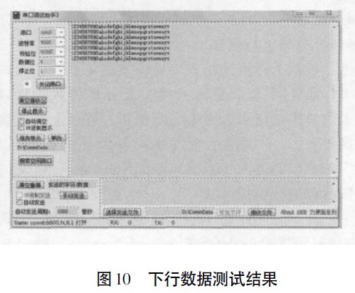 測試方法是利用運行在PC 機上的客戶端程序每秒鐘發(fā)送連續(xù)數(shù)據(jù)流,觀察另一臺PC 機上串口調(diào)試助手是否正常接收到數(shù)據(jù)。試驗測試結(jié)果如圖10 所示,當客戶端程序發(fā)送數(shù)據(jù)時,在終端串口設(shè)備上得到同樣的數(shù)據(jù)流。