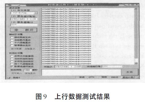 測試方法為每秒鐘連續(xù)不斷地發(fā)送“1234567890abcdefghijklmnopqrstuvwsyz”,使之構(gòu)成100KByte 的數(shù)據(jù)包,觀察客戶端程序能否正常收到這個數(shù)據(jù)包。試驗測試結(jié)果如圖9 所示,當從“終端串口設(shè)備”向上位機發(fā)送100KByte 數(shù)據(jù)時,在客戶端一側(cè)正常收到了這些數(shù)據(jù),并且沒有丟失現(xiàn)象。
