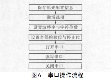 串口設(shè)置主要設(shè)置struct termios 結(jié)構(gòu)體成員,具體的串口操作函數(shù)此處略去,串口操作流程如圖6 所示。