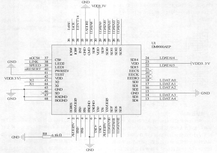 DM9000AEP 是一款高集成度且成本較低的單片快速以太網(wǎng)媒體介質(zhì)訪問層MAC 控制器,上有通用處理器接口,10M/100M 物理層和16KbyteSRAM,低功耗、高性能IO 管腳兼容3. 3 /5. 0V 電壓。DM9000AEP 合成了以太網(wǎng)MAC、物理層PHY 和MMU,內(nèi)置AUTOMDI2X 功能10 /100MPHY,芯片可以根據(jù)處理器提供8 /16 /32bit 3 種連接方式實現(xiàn)以太網(wǎng)MAC 層和PHY 層) 的功能。