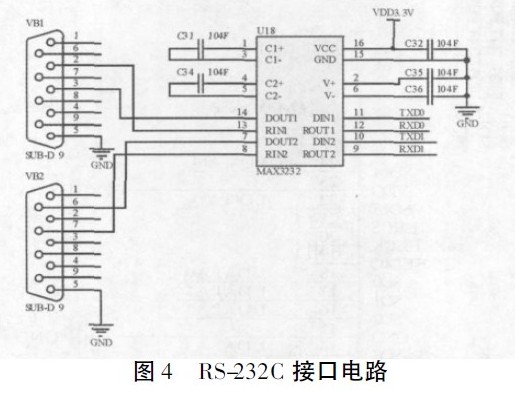 S3C2440 本身自帶三路獨立的UART 接口,在設(shè)計嵌入式串口服務(wù)器系統(tǒng)時,應(yīng)用了S3C2440 串口模塊的兩路UART 接口,另外一路UART 接口做開發(fā)時的打印控制臺用。這兩路串行口用三線通信,采用MAX3232 作為電平轉(zhuǎn)換芯片,分別配置處理器的GPH2、CPH3、CPH4 和CPG5,4 個GPIO 口為TXD0、RXD0、TXD1 和RXD1 串口收發(fā)信號線。RS-232C 接口電路如圖4 所示。