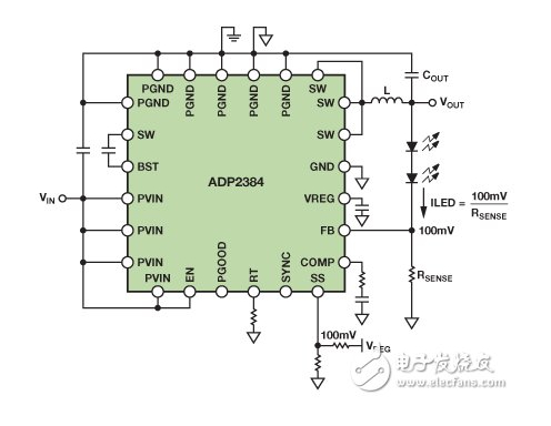 使用現(xiàn)成的降壓穩(wěn)壓器調(diào)節(jié)LED電流非常簡單。此處的示例采用了ADP2384.更加詳盡的論文還包括使用 ADP2441的示例,該器件的引腳較少,具有36 V輸入電壓范圍。該文顯示了一些示例,展示如何實(shí)施專用LED降壓穩(wěn)壓器提供的很多“智能”功能,例如LED短路/開路故障保護(hù)、RSENSE開路/短路故障保護(hù)、PWM調(diào)光、模擬調(diào)光和電流折返熱保護(hù)。我們在本文中將使用上例中的ADP2384,討論P(yáng)WM和模擬調(diào)光、電流折返。