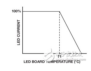 由于LED的使用壽命在很大程度上取決于其工作結(jié)溫,有時(shí)必須監(jiān)控LED溫度,如果溫度過高,必須做出響應(yīng)。導(dǎo)致異常高溫的原因可能是散熱器連接不當(dāng)、周邊溫度過熱或其他一些極端條件。常見解決方案是在當(dāng)溫度超過某個(gè)閾值時(shí)減小LED電流(圖13)。這稱為LED 熱折返。