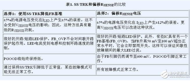 這種方法的缺點(diǎn)是RSENSE和FB之間的偏移受到電源的嚴(yán)重影響。使用ADR5040等精密基準(zhǔn)電壓源可能是理想的,但不太的±5%基準(zhǔn)容差可能在LED電流上產(chǎn)生±12%的變化。表1顯示了比較結(jié)果: