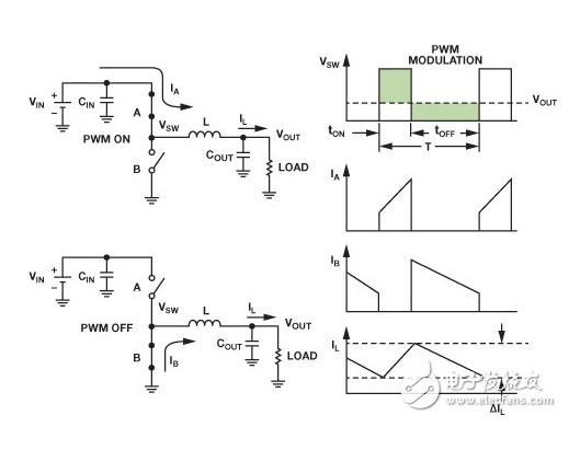 降壓穩(wěn)壓器對輸入電壓進(jìn)行斬波,并通過LC濾波器傳送,以提供穩(wěn)定的輸出,如圖3所示。它使用兩個(gè)有源元件和兩個(gè)無源元件。有源元件是從輸入到電感的開關(guān)“A”,以及從地面到電感的開關(guān)(或二極管)“B”.無源元件是電感(L)和輸出電容(COUT)它們形成LC濾波器,可以減小由有源元件產(chǎn)生的紋波。