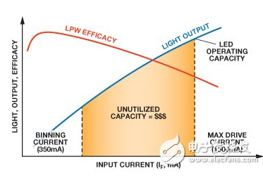 降低整體燈具成本的一種方法是在產(chǎn)品規(guī)格允許的范圍內(nèi),在可能的直流電流下驅(qū)動(dòng)LED.此電流可能遠(yuǎn)高于其“分檔電流”.如果正常驅(qū)動(dòng),這樣可能產(chǎn)生更高的流明/成本比率。