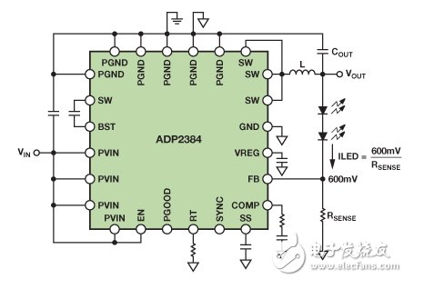 如果開關(guān)是內(nèi)部的,則降壓器稱為穩(wěn)壓器 如果開關(guān)是外部的,則稱為 控制器如果兩個(gè)開關(guān)都是晶體管(MOSFET或BJT),則它是同步 的,如果底部的開關(guān)是使用二極管實(shí)施的,則它是 異步 的。這些類型的降壓電路各有優(yōu)劣,但同步降壓穩(wěn)壓器通常可以優(yōu)化效率、器件數(shù)量、解決方案成本和電路板面積。遺憾的是,用于驅(qū)動(dòng)高電流LED(高達(dá)4 A)的同步降壓穩(wěn)壓器很少,而且成本昂貴。本文以 ADP2384為例,展示如何修改標(biāo)準(zhǔn)同步降壓穩(wěn)壓器的連接以調(diào)節(jié)LED電流。