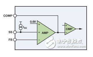 很多通用降壓IC包括軟啟動(dòng)(SS)或跟蹤(TRK)引腳。SS引腳可緩慢增加啟動(dòng)時(shí)的開關(guān)占空比,從而地減小啟動(dòng)瞬變。TRK引腳讓降壓穩(wěn)壓器能夠遵循獨(dú)立電壓。這些功能通常結(jié)合到單個(gè)SS/TRK引腳上。大多數(shù)情況下,誤差放大器將SS、TRK和FB電壓中的值與基準(zhǔn)進(jìn)行比較,如圖6所示。