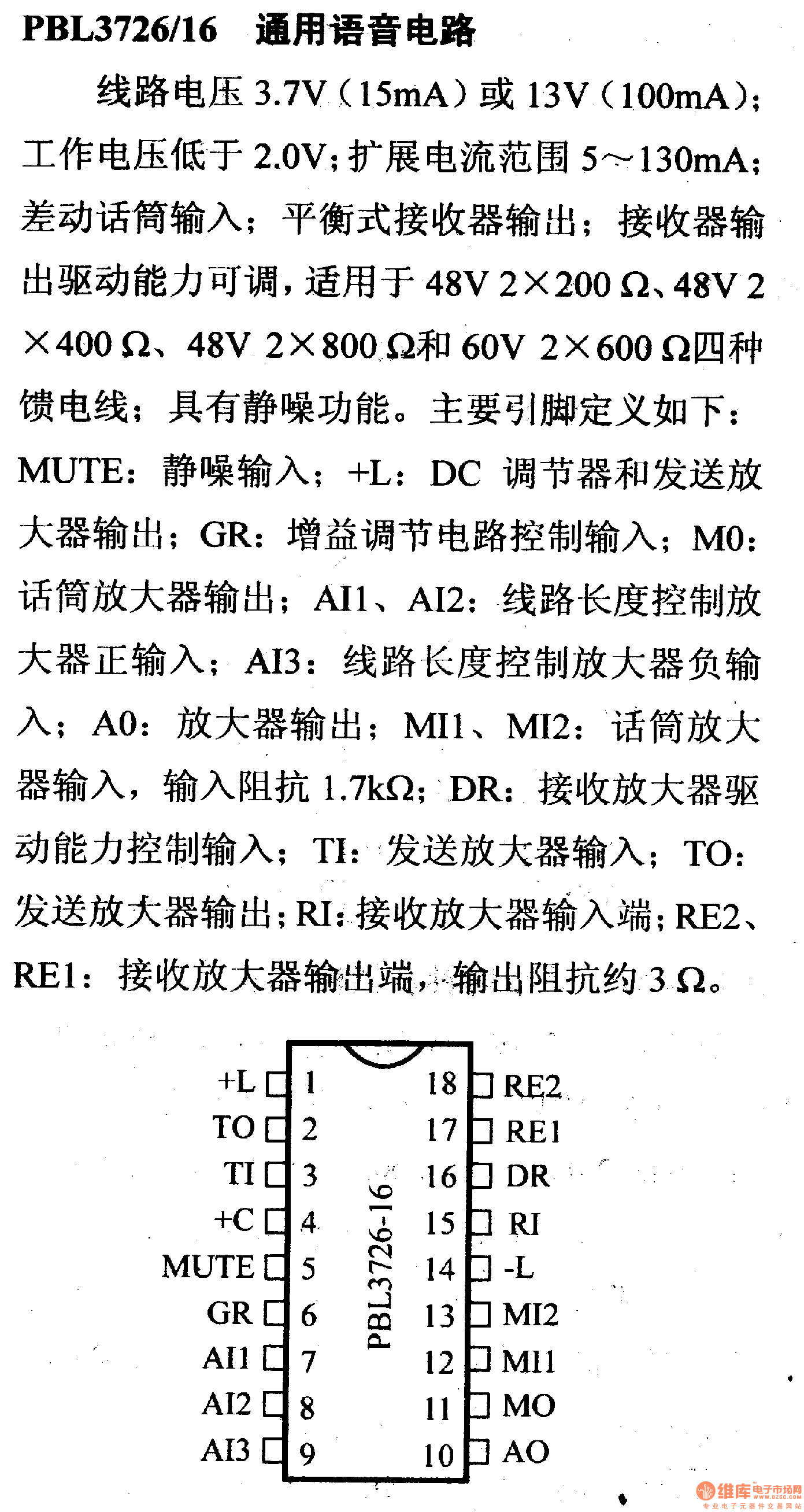 電路引腳及主要特性PBL3726/16 通用語(yǔ)言電路