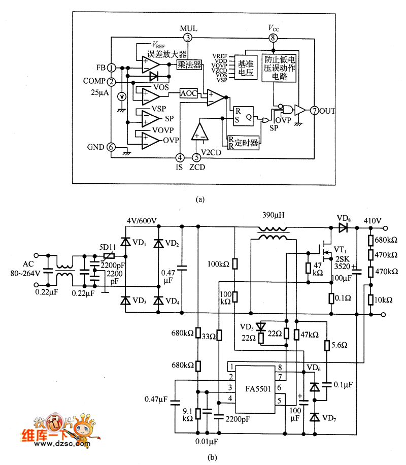 圖(a)是FA5501的內(nèi)部等效電路,片內(nèi)有各種功能,主要特點(diǎn)如下:片內(nèi)采用30V高耐壓的CMOS工藝,由此消耗功率很低,啟動(dòng)電流為20pA,工作電流為2mA;片內(nèi)有輕負(fù)載補(bǔ)償電路,從額定負(fù)載到空載都能進(jìn)行恒壓控制;片內(nèi)有FB短路檢測(cè)功能,當(dāng)檢測(cè)到輸出電壓異常時(shí)電路停止工作;片內(nèi)有過壓保護(hù)功能與重新啟動(dòng)定時(shí)器;可以直接驅(qū)動(dòng)功率MOS場(chǎng)效應(yīng)管,源電流為500mA,吸收電流為IA;片內(nèi)具有低電壓誤動(dòng)作防止電路。
