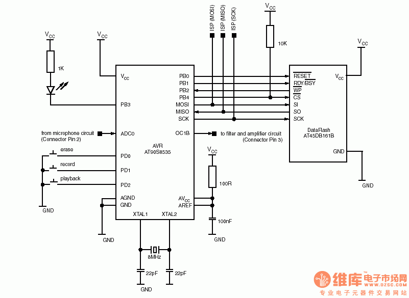 請(qǐng)問一下,關(guān)于單片機(jī)接AT45DB×××FLASH時(shí),CS的處理 janeslee,你好。你在連接AT45DB×××?xí)r,它的片選信號(hào)您是如何加的啊,因?yàn)槲铱?a target="_blank" href="http://www.udpf.com.cn/icstock/151/ATMEL.html">ATMEL 公司的資料“AVR335: DIGITAL Sound Recorder with AVR and DataFlash”中的一種連接圖中,cs片選信號(hào),加了一個(gè)10K的上拉電阻,不知到在您使用AT45DB×××?xí)r是否有加(圖我附在帖子后面了),還有在圖中MOSI、MIOS和SCK的分別有三個(gè)線聯(lián)到ISP(MOSI)、ISP(MIOS)和ISP(SCK),他們的作用是什么。克麄兪遣皇窃谙騿纹瑱C(jī)燒程序時(shí)用的。课也挥萌ダ頃(huì)? 謝謝 很感謝您的帖子,把自己的經(jīng)驗(yàn)告訴大家。
