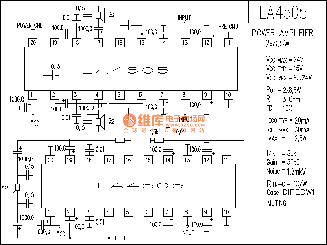 LA4505集成電路采用20腳雙列直插式塑料封裝,其弓腳功能及數(shù)據(jù)見表所列。